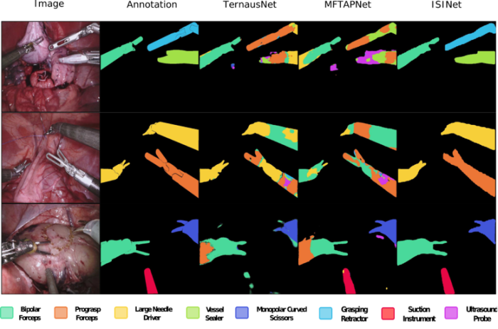 Figure 1. Each row depicts an example result for the task of instrument type segmentation on the EndoVis 2017 and 2018 datasets. The columns from left to right: image, annotation, segmentation of TernausNet [28], segmentation of MFTAPNet [15] and the segmentation of our method ISINet. The instrument colors represent instrument types.