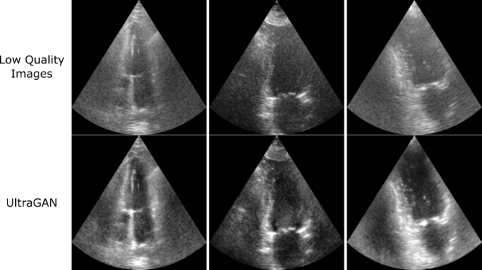 Ultrasound images are used for a wide variety of medical purposes because of their capacity to study moving structures in real time. However, the quality of ultrasound images is significantly affected by external factors limiting interpretability. We present UltraGAN, a novel method for ultrasound enhancement that transfers quality details while preserving structural information. UltraGAN incorporates frequency loss functions and an anatomical coherence constraint to perform quality enhancement. We show improvement in image quality without sacrificing anatomical consistency. We validate UltraGAN on a publicly available dataset for echocardiography segmentation and demonstrate that our quality-enhanced images are able to improve downstream tasks. To ensure reproducibility we provide our source code and training models.