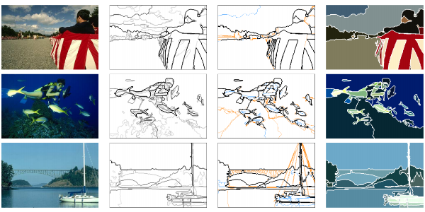 La segmentation de bas niveau est la tâche qui consiste a extraire les caracteristiques geometriques d’une image en creant une partition de son domaine de definition sans connaitre prealablement son contenu semantique. L’approche proposee dans cette these repose sur la formulation du probleme dans le cadre metrique, ou les partitions de l’espace sont determinees par la definition d’une distance. Deux types de distances sont etudies afin d’appliquer le formalisme metrique a la segmentation d’images naturelles. Le premier est obtenu en mesurant une energie le long des chemins. Nous construisons notamment une distance definie par le minimum de la variation totale de l’image sur les chemins. Nous considerons ensuite une representation hierarchique des contours des images fondee sur un deuxieme type de distances, les ultrametriques. Enfin, au moyen de segmentations humaines, nous evaluons quantitativement notre approche et la comparons a d’autres methodes de segmentation.